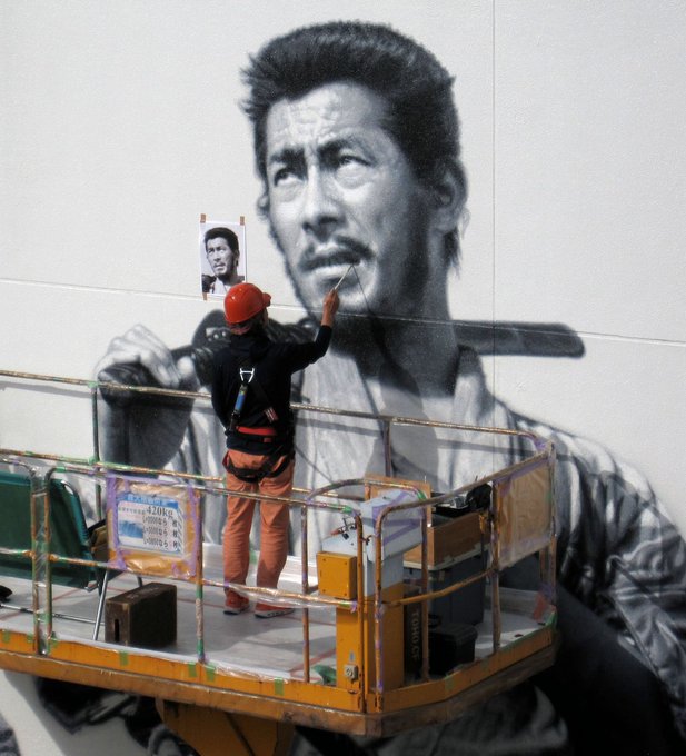 125 259 大きな絵も描いてます。巨大壁画。(赤&ピンクの作者が極小…) #七人の侍 #壁画 #東宝スタジオ 20/07/21 19:43