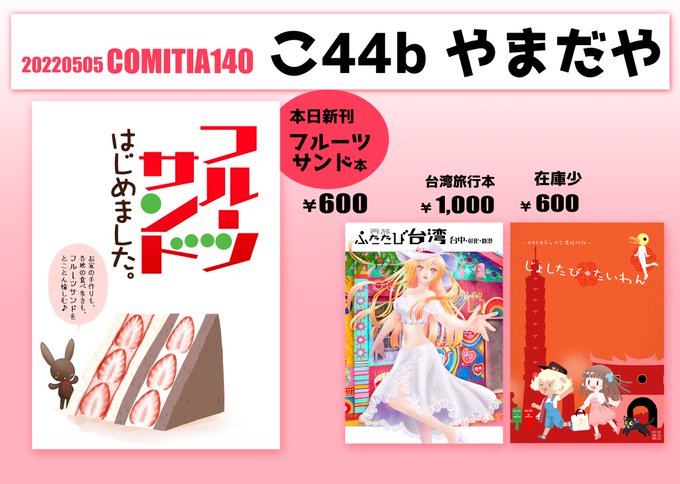#コミティア140 こ44b やまだや 既刊、台湾旅行本【じょしたび・たいわん】完売となりました。 どうもありがとうございます。 新刊フルーツサンド本ございますので、どうぞ宜しくお願い致します。 twitter.com/m_k_yamada/sta…