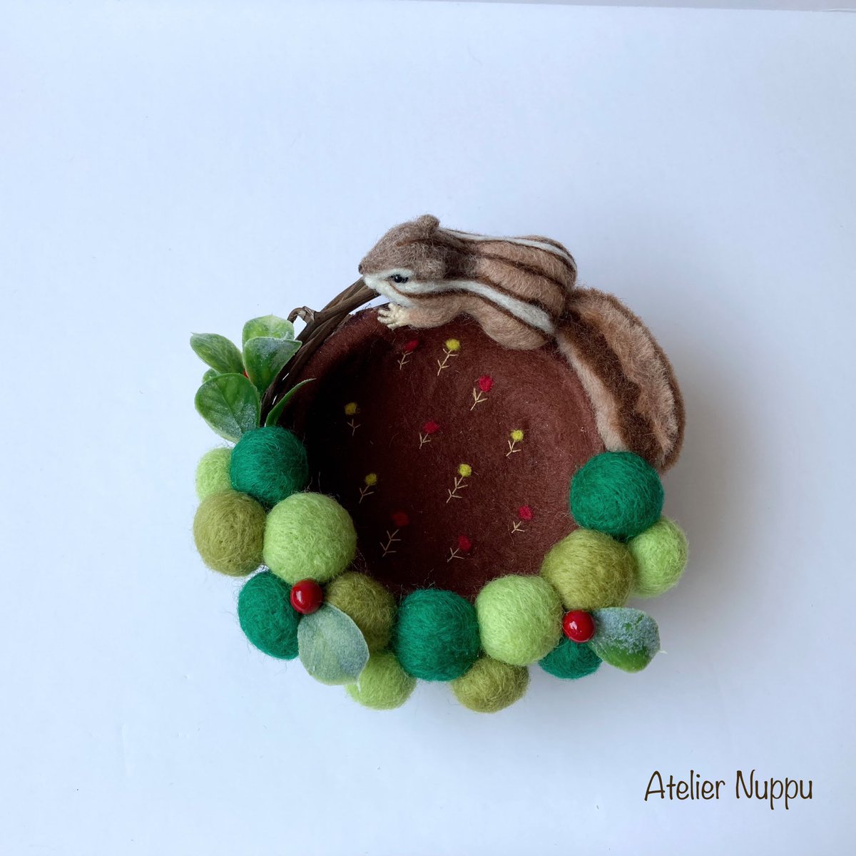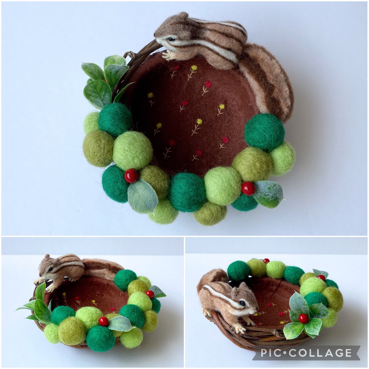 おはようございます☀ 昨日投稿した新作のリース風小物入れをもう一つ。 【新作】まんまる森を駆け回る子リスの小物入れ🌳🐿 木の上で走り回っている子リスをイメージしました◎ #刺さる人に届けばいい #羊毛フェルト #ハンドメイド