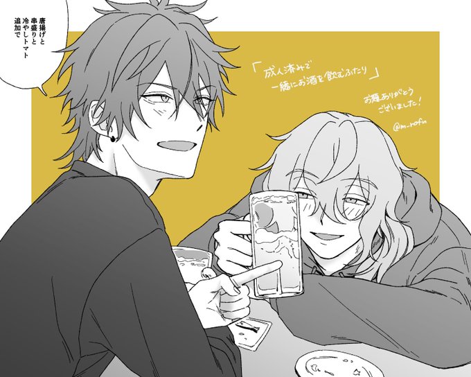 > エアスケブお願いしたいです! 成人済みで一緒にお酒を飲むふたりが見たいです!よろしくお願いします! #odaibako_m_rofu odaibako.net/detail/request… webオンリーのとき募集したエアスケブです!大変お待たせしました!お題ありがとうございました😚🍻