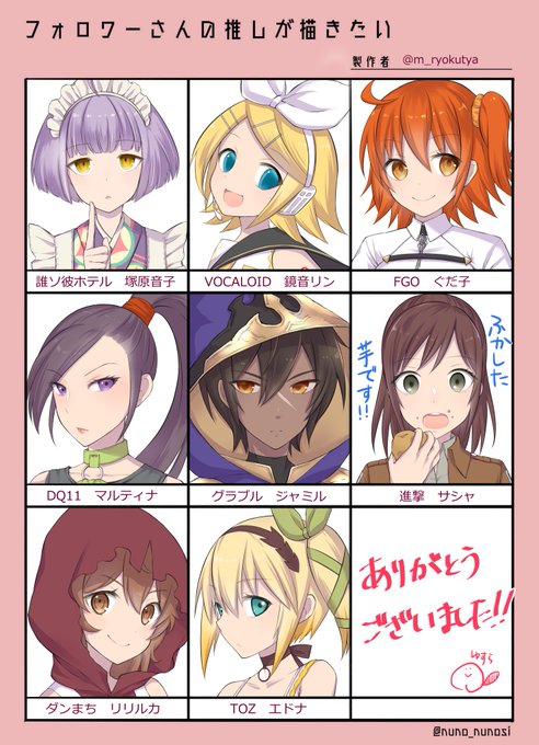 #フォロワーさんの推しが描きたい 誰ソ彼ホテル 塚原音子 VOCALOID 鏡音リン FGO ぐだ子 DQ11 マルティナ グラブル ジャミル 進撃の巨人 サシャ ダンまち リリルカ TOZ エドナ でした。お時間頂いてしまいましたが、お付き合いいただきありがとうございました!😊😊😊