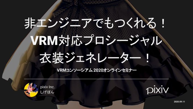 VRMコンソーシアム 2020オンラインセミナーで講演した「非エンジニアでもつくれる!VRM対応プロシージャル衣装ジェネレーター!」の発表資料の方を公開しました。 スピーカーノートの方で口頭で話した内容も読むことができます。 #VRMコンソーシアム #VRoid #MagicalTexture docs.google.com/presentation/d…