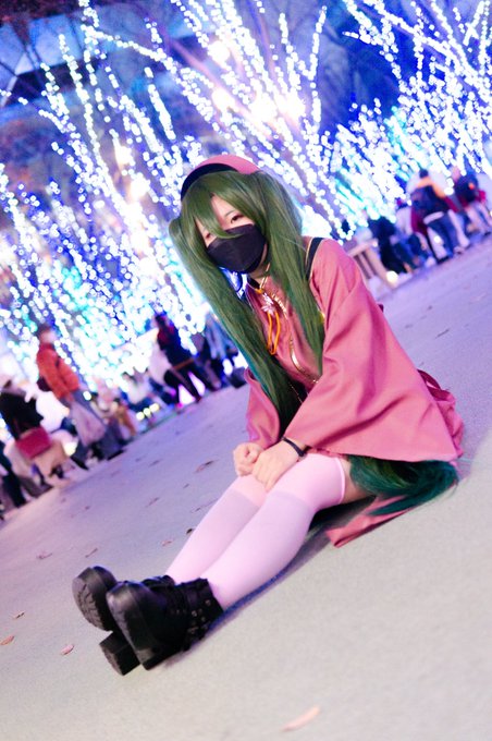 📸@Rance_Brionac 様 ※コスプレ注意 #cosplay #アコスタさいたま #コスプレ初心者 千本桜ミク様 座りポーズ。 顔面宜しくないのでマスク装着….(^^)