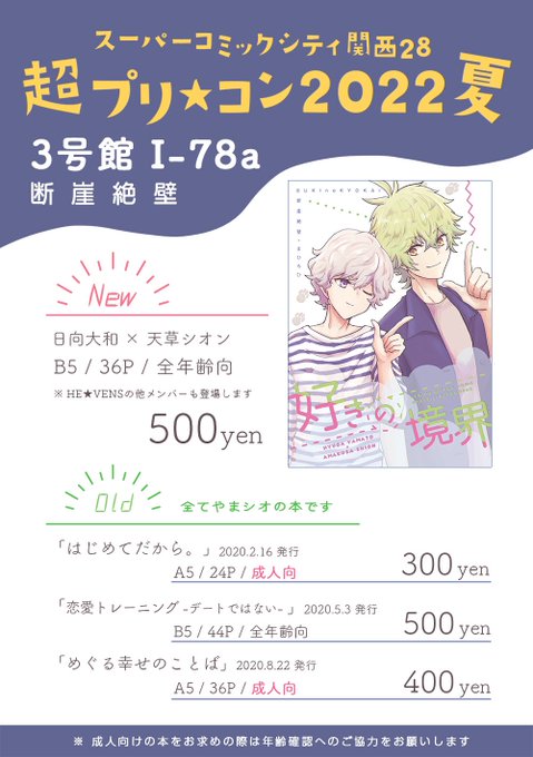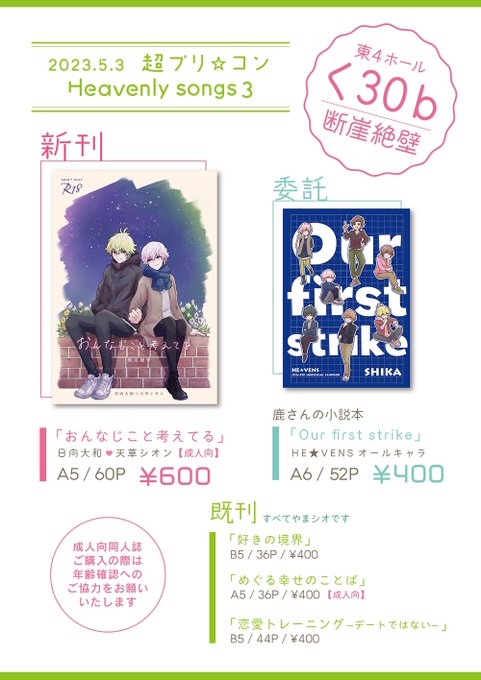 明日開催スパコミ内超プリ★コンでのお品書きです📗 新刊サンプル(pixiv)↓ pixiv.net/artworks/10058… 委託通販(とらのあな)↓ ecs.toranoana.jp/joshi/ec/item/… 全部やまシオです! お買い物のため離席することがあります!どうぞよろしくお願いいたします🙏