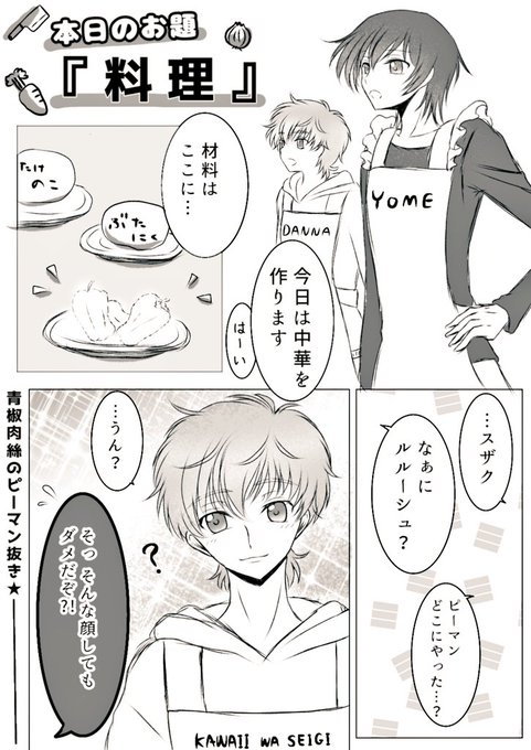 33 114 #スザルル版深夜の絵描き文字書き60分一本勝負 お題『料理』 ※料理してないです! ※ピーマン苦手なスザクくん 21/11/20 23:11