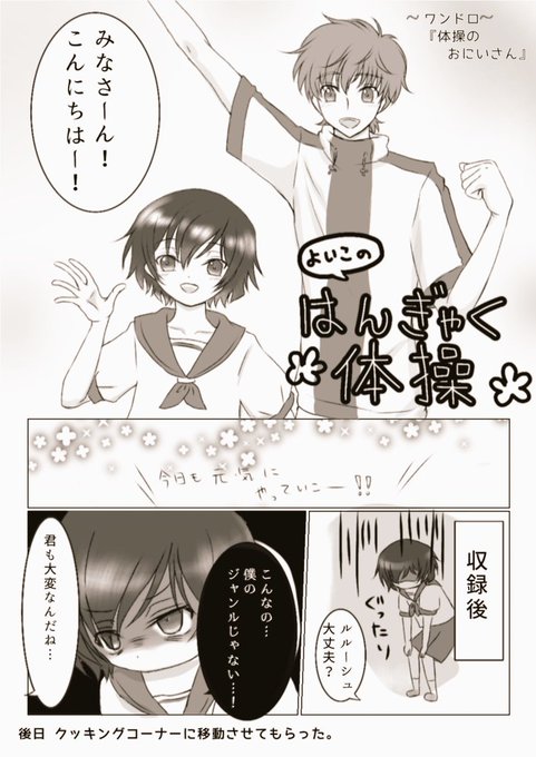 #スザルル版深夜の絵描き文字書き60分一本勝負 遅刻参加で失礼します🙇♂️ お題「体操のおにいさん」 スザクおにいさんと人気子役ルルーシュ +10分です