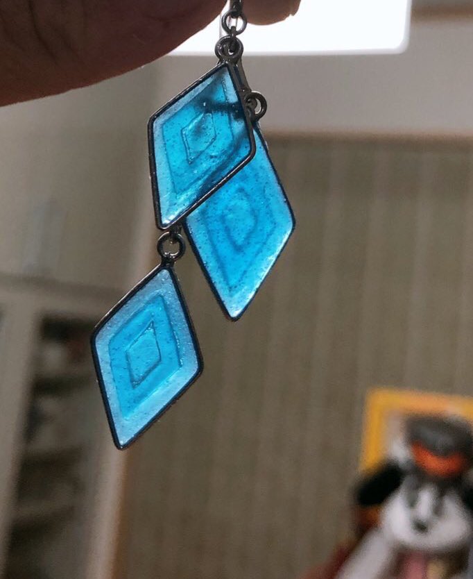 リーチ兄弟のピアスついつい作ってしまった..... ピアス開けてないから代わりに樹脂ピアスで作ったけどまあまあ良い感じ😊 蓄光パウダー入れたから暗いところに行くとぼんやり光って綺麗~! #ツイステ #ツイステ手芸部 #ツイステファンアート