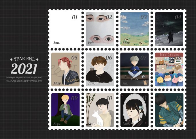 มค-เม.ย ยังไม่ได้กลับมาวาดรูปจริงจัง เพราะงั้นรูปที่ 02-04 จริงๆแล้วน้องอัดกันอยู่เดือนเมษาถึงมิถุนา แต่ชอบก็เลยเอามาใส่เดือนที่ว่าง บางรูปก็คาบเกี่ยวกันแต่ก็เรียงตามไทม์ไลน์🤍🤏🏼 ขอให้ปีหน้าวาดได้เยอะกว่านี้แล้วก็หาลายเส้นที่ชอบเจอ🥺 #Artsummary2021