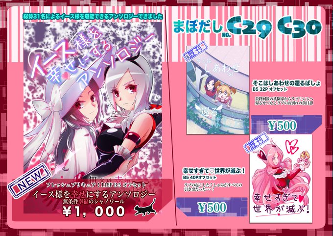 80 110 4/23開催 レインボーフレーバー28にてスペースC29,30にて頒布させて頂くお品書きです 総勢31名(主催含む)参加のフレッシュプリキュアアンソロジー「イース様を幸せにするアンソロジー」頒布させて頂きます ほか既刊2種となります。 場合によっては色紙若干数用意? よろしくです! #レイフレ28 23/04/17 00:51
