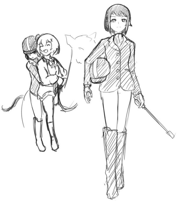 22 52 乗馬服はバチバチに似合うけど乗馬はてんでダメなので仕方なく零奈と相乗りする海月が見たいよ〜の絵 #電音部美術部 23/01/17 01:35