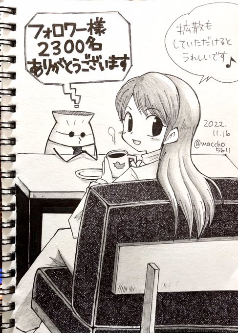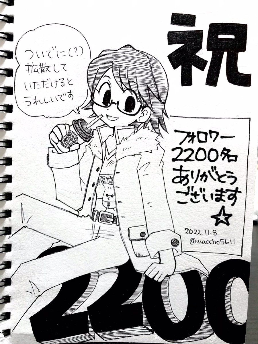 フォロワー様2200名達成ありがとうございます! 今回もオリキャラでキリ番絵らしきものを描かせて頂きました。なんと直筆コメント付!(←いらない) こんな奴ですが今後ともよろしくお願いします。 #私の絵柄が好みって人にフォローされたい #フォロバ100パーセント (怪しいアカウント以外は)