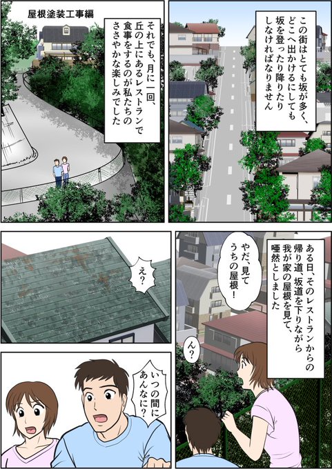フォロワーさんが増えてきたので再掲しちゃいます😋 🏡せっかく屋根塗装をしたのに雨漏りの原因に……?!😱 屋根塗装後に発生する雨漏りの原因を、街の屋根やさんが調査する漫画(1/2) #漫画が読めるハッシュタグ #企業公式冬のフォロー祭