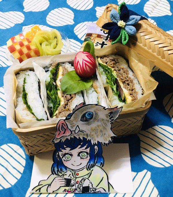 0 11 本日は伊之助のおにぎりが美味そうだったのでおにぎらず弁当‼️ (どうせならおにぎれよ‼️😆) #鬼滅の刃 #嘴平伊之助 #ペーパークラフト #おにぎらず #弁当記録 20/12/07 07:30