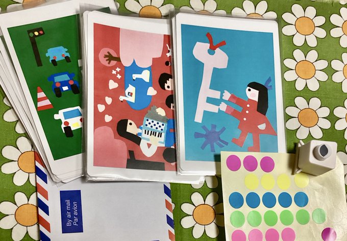 まだ先だけど、11月のポストカード展のための作業を 夜な夜なしています。楽しい。一枚一枚角丸にしてます^ ^ #マコイ #ポストカード #イラスト