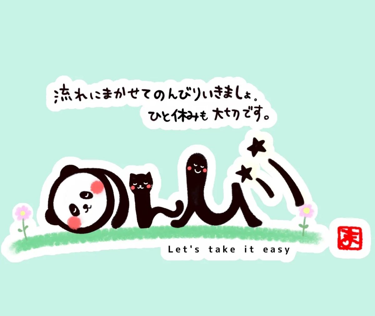 今日の感じ文字は「のんびり」です。 の→パンダ ん→猫 び→人と星 り→流れ星 をイメージして描きました。 せっかく迎えれた大切な1日。 Let's take it easy. 口角上げて 気楽にいきましょう~♪ 感じ文字で、みなさまの心が少しでも晴れますように🌈 #感じ文字 #のんびり #イラスト #メッセージ