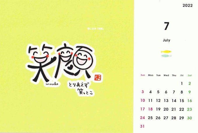 7月始まりました❗🌴🌺🌻🌊 感じ文字は「笑顔」です☺️ 辛いこと、悲しいこと、嫌なこと、色々とあるけどさ…🥺 いったん忘れて とりあえず笑っとこ~😁 笑ってたらいいことありますから(*≧∀≦*) 今月も笑顔いっぱいでよろしくお願いいたします❗ #カレンダー #感じ文字 #笑顔 #イラスト