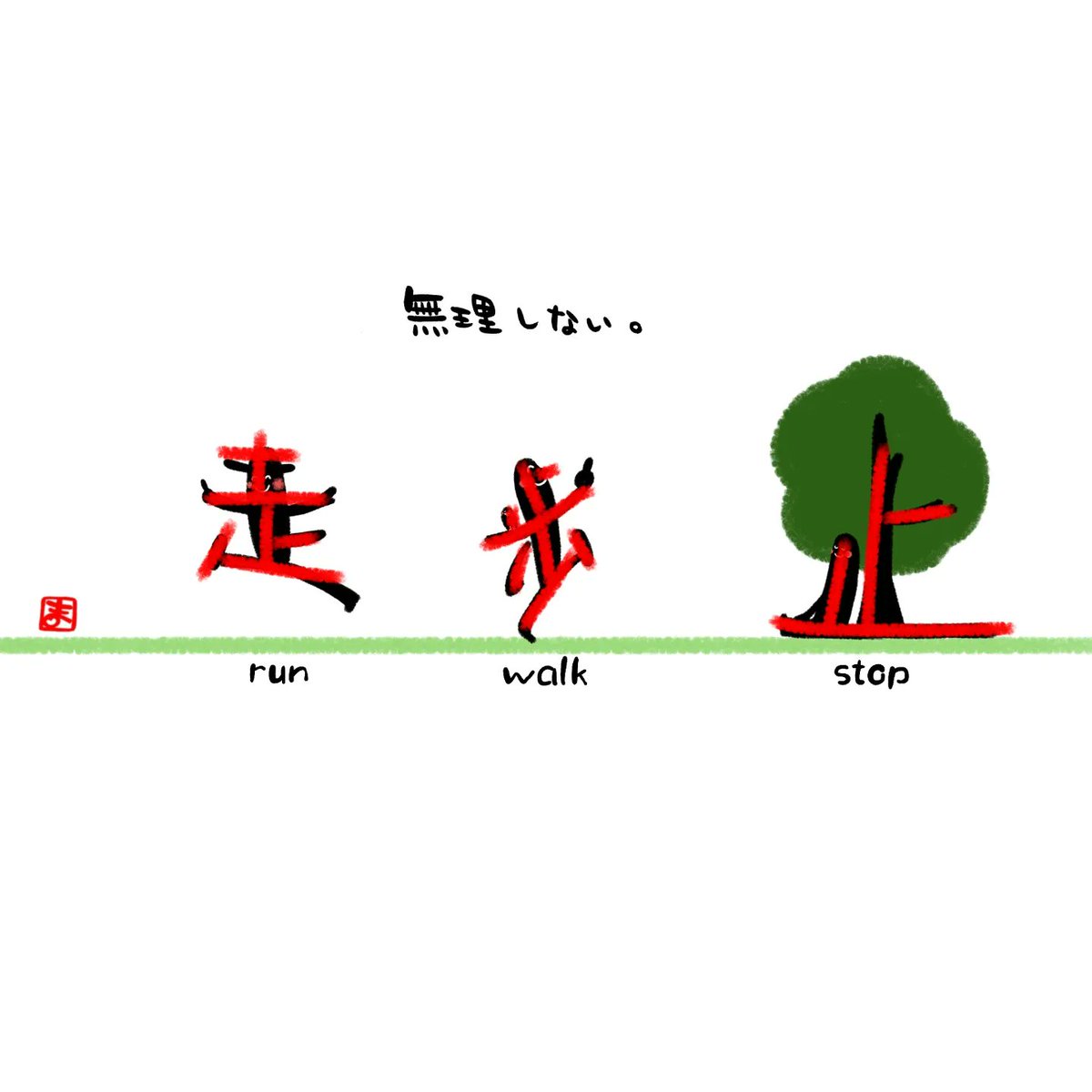 ・ 今日の感じ文字は「走 歩 止」です。 今のあなたのちょうどいいペースはどれですか? いまの私は 歩くと、止まるの繰り返しです☺️ 無理しない。 マイペースでいきましょう🎵 #感じ文字 #イラスト #メッセージ #癒し #ポストカード #Tシャツ #グッズ販売