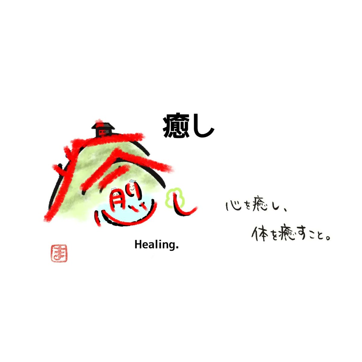 今日の感じ文字は「癒し」です。 頂上を目指して山を登る人、 温泉に入る人をイメージして描きました😃 「心を癒すこと。 体を癒すこと。」 が大切です😄 皆さんも、頑張り続けるために お休みも大切にしてくださいね😌 そしてまた頑張りましょう✨ #感じ文字 #癒し #メッセージ #イラスト