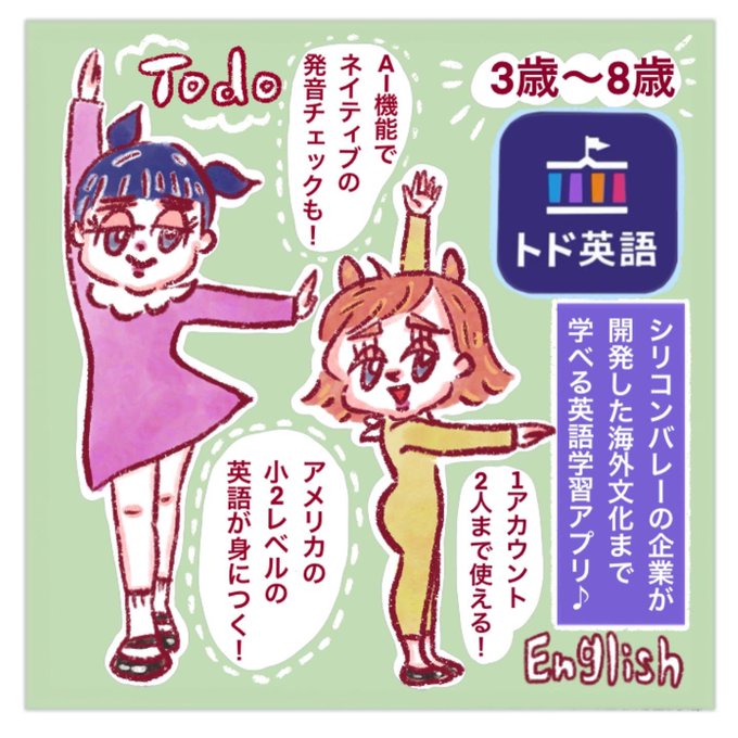 シリコンバレーの企業の英語だけじゃなくアメリカのマナーや文化も学べて発音チェックもしてくれるアプリの体験レポです😉ネイティブの子どものプログラムで大人も楽しい❣️全8ページ描きました👩🏻🎨#illustrationartist #育児漫画 #漫画が読めるハッシュタグ #トド英語 #トド英語の夏休み #todoenglish