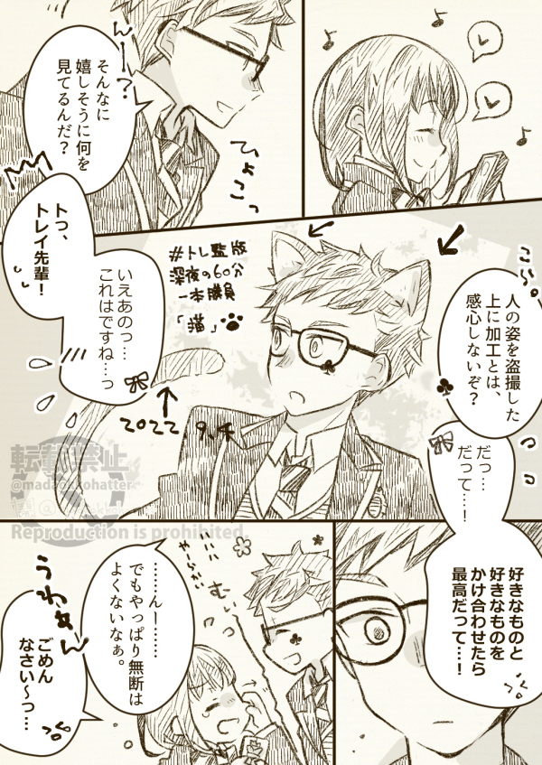 #トレ監版深夜の60分一本勝負 お題『猫』 時間を勘違いしていたり色々ありつつ実質作業時間2時間弱です。悪い気はしないけど窘めるところはちゃんと窘める先輩。 #twstプラス #twst_NL