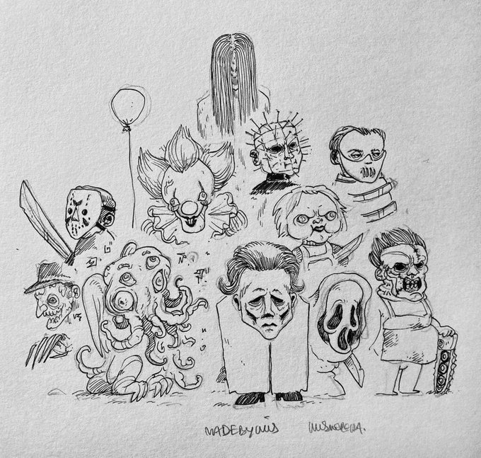 Last #inktober2021 post is a biggy ☺️✨ ultimate #halloween #illustration with a lot of greats :b did I forget any BIG horror creatures ?. . . . . #jasonvoorhees #michaelmyers #thering #cthulhu #it #itmovie #freddykrueger #pinhead #leatherface #s… ift.tt/3EyrMv6