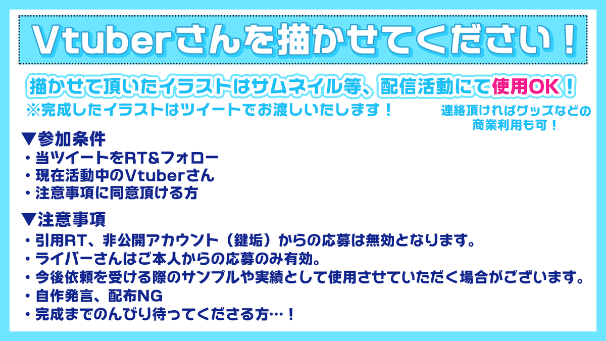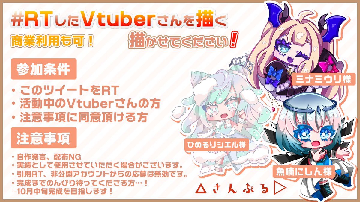 #RTしたVtuberさんを描く SD練習の為描いてもいいよ~という方がおりましたら…! 気になった方を数名描かせて頂きたいと思います! 添付画像をお読みの上でご応募ください! よろしくお願いいたします! 🌟参加条件 このツイートをRT(フォローは任意) 完成したイラストはFAタグに投稿いたします!