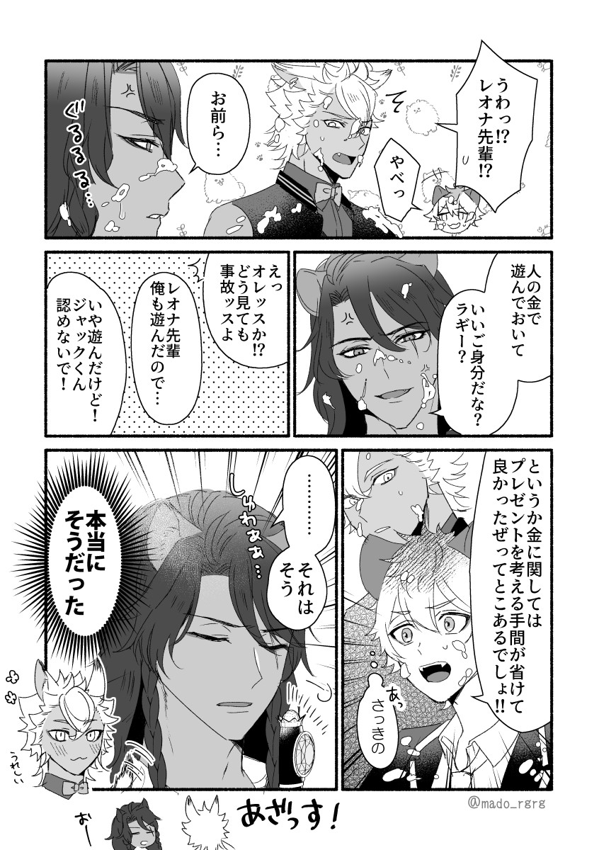 ジャックくんのユニバパソスト最高でした。グルビ絵にレオナさんがいることからパソスト続きを妄想してみた漫画です。 ネタバレを含みます。おめでとう! #ジャック・ハウル誕生祭2021 #ジャック・ハウル生誕祭2021