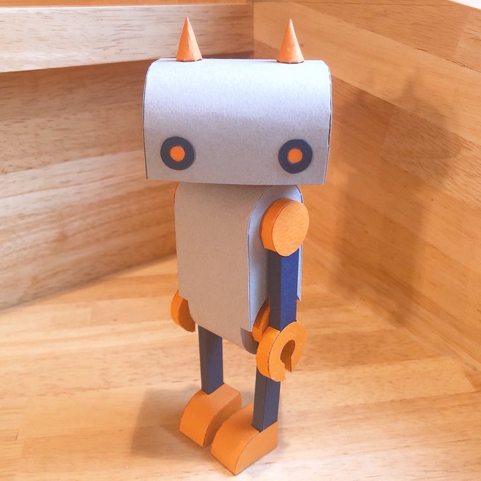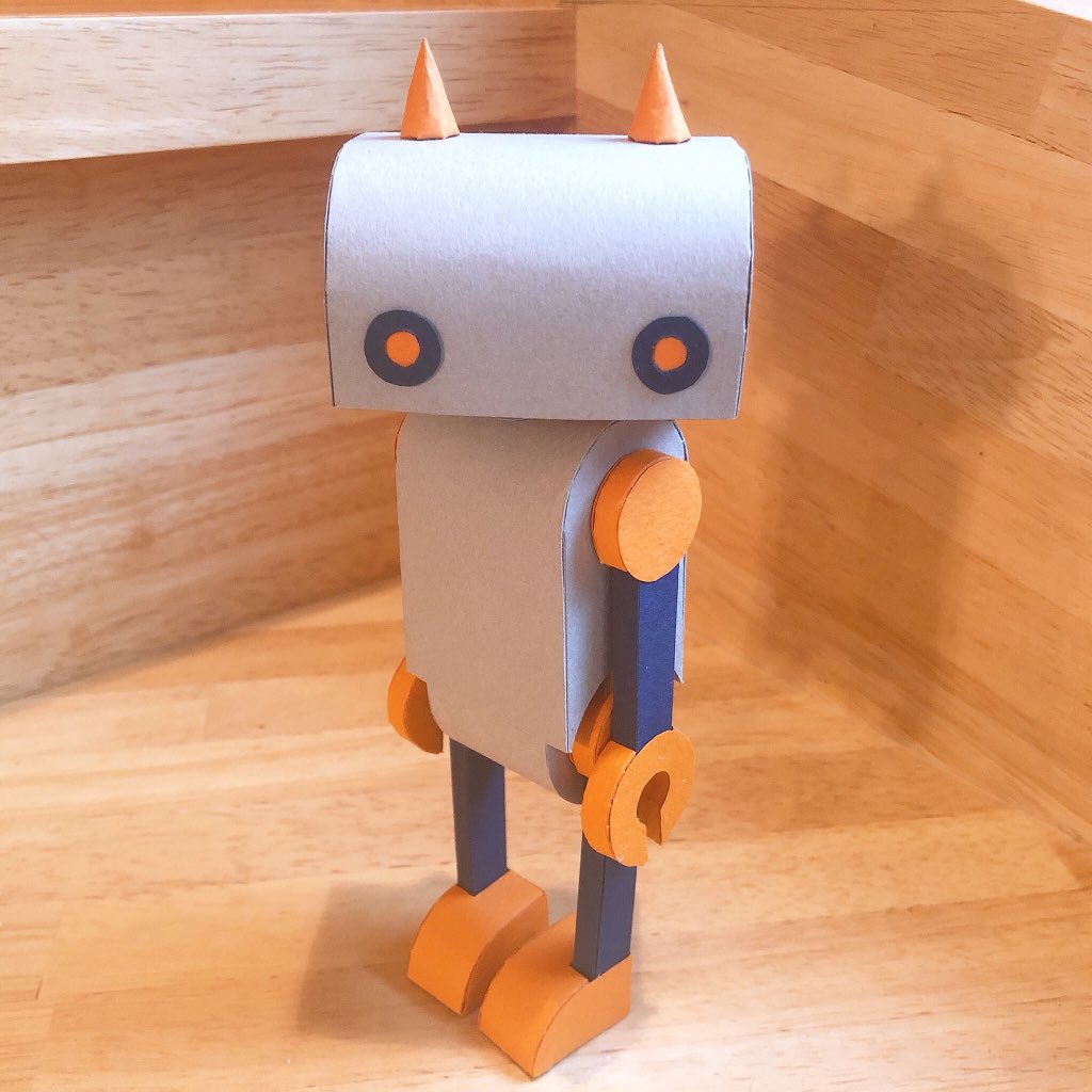 5 26 立体ペーパークラフトに挑戦。 設計図なし、いきあたりばったりで完成した鬼ロボくん🤖🔧 首と肩と股関節が動くよ。 #ペーパークラフト #工作 #ロボット #100よーかい 20/07/09 15:11