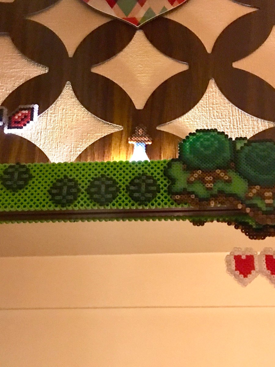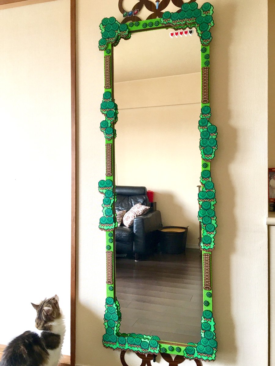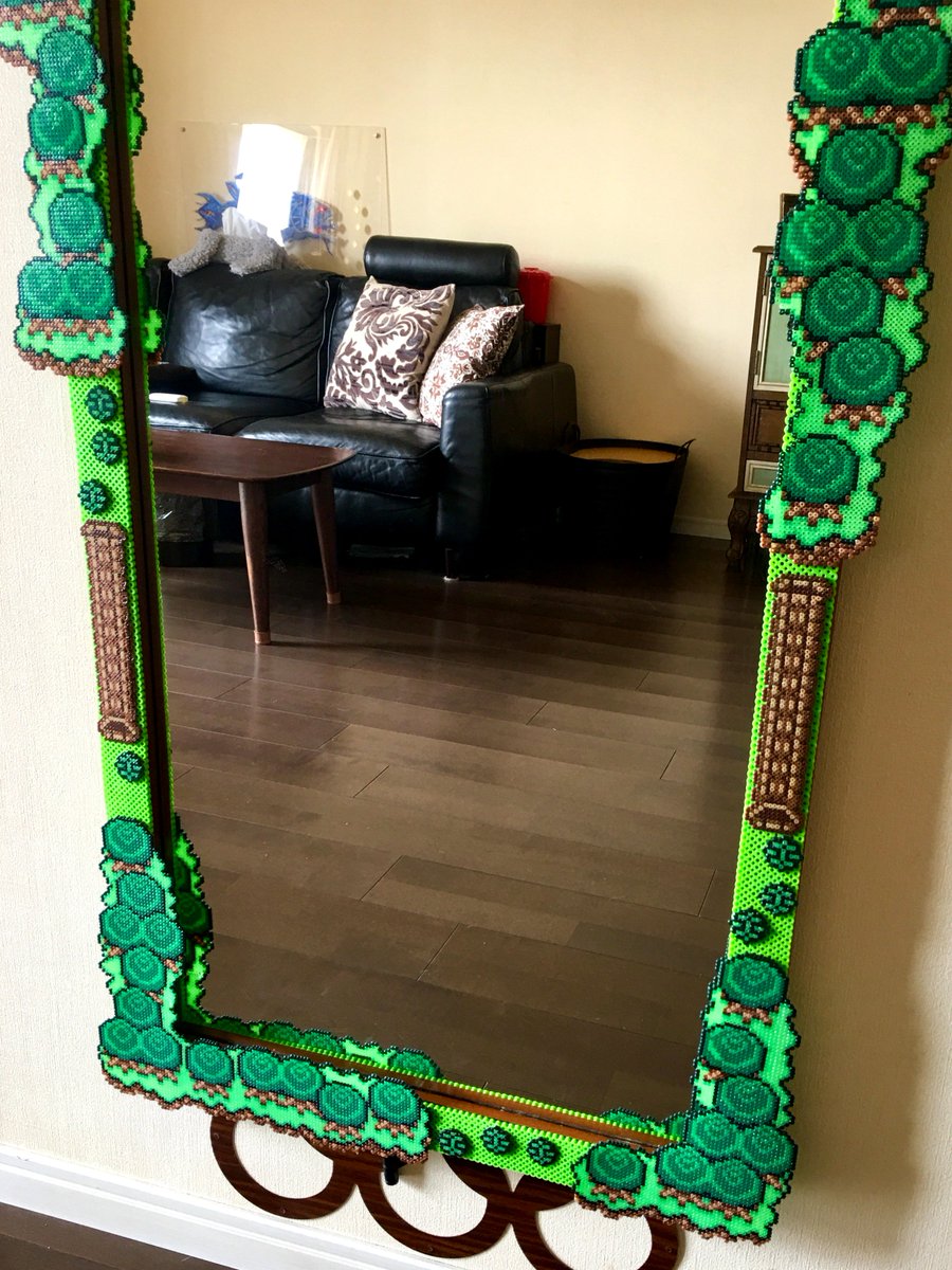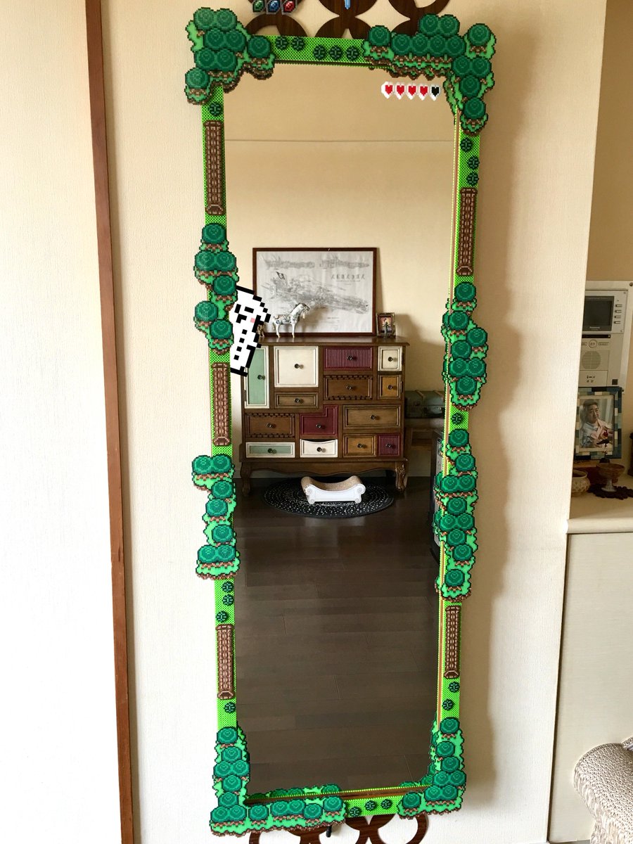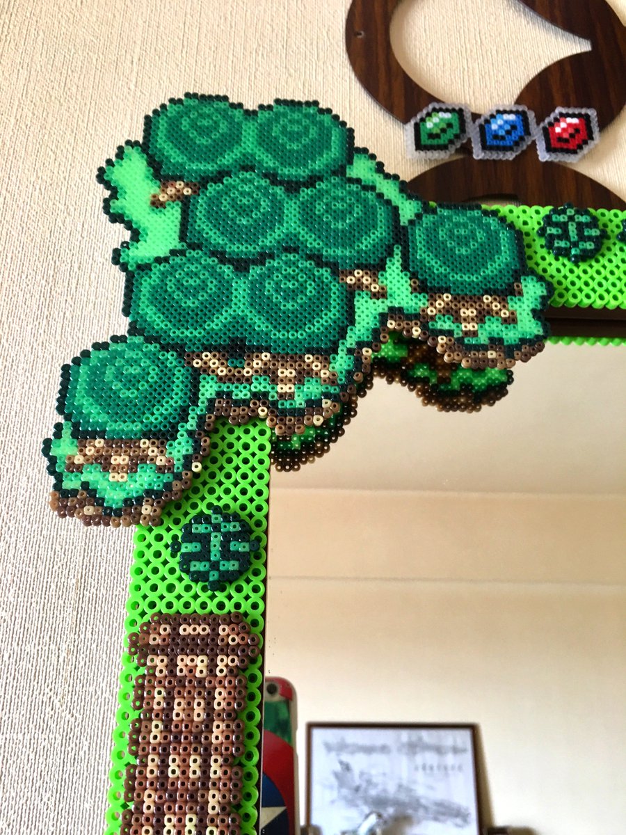 「ゼルダの伝説 神々のトライフォース」ウォールミラー完成!アイロンビーズ(土台は直径5mmのパーラービーズ。ドット絵は直径2.6mmのミニフューズビーズ)です。まずは細部