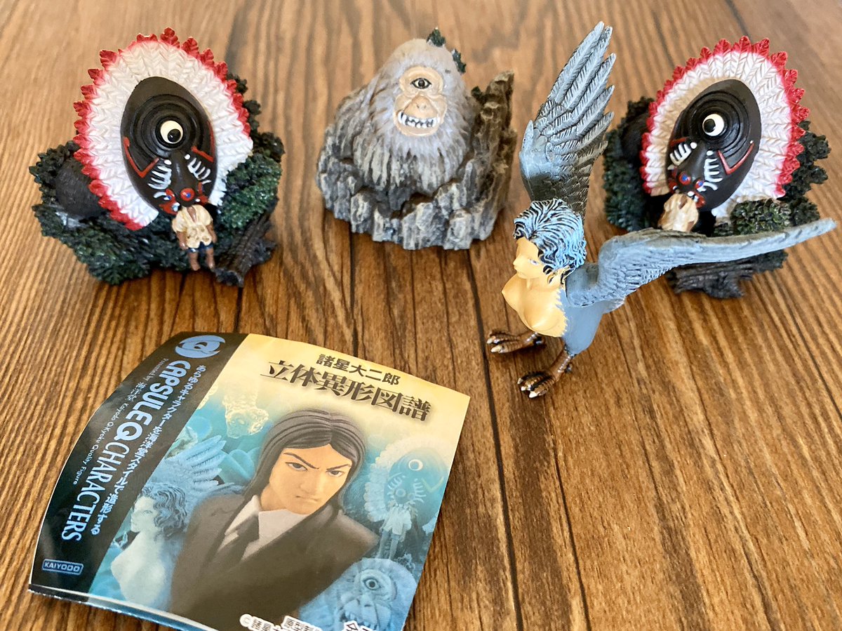 諸星大二郎ガチャ。スーパーのアンパンマンガチャなどの横で発見なぜなのか。今なら半額!とあり、ここじゃそうだろうね…と思いつつホクホク回す(アエン出すぎ問題)