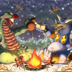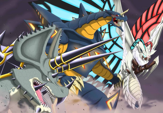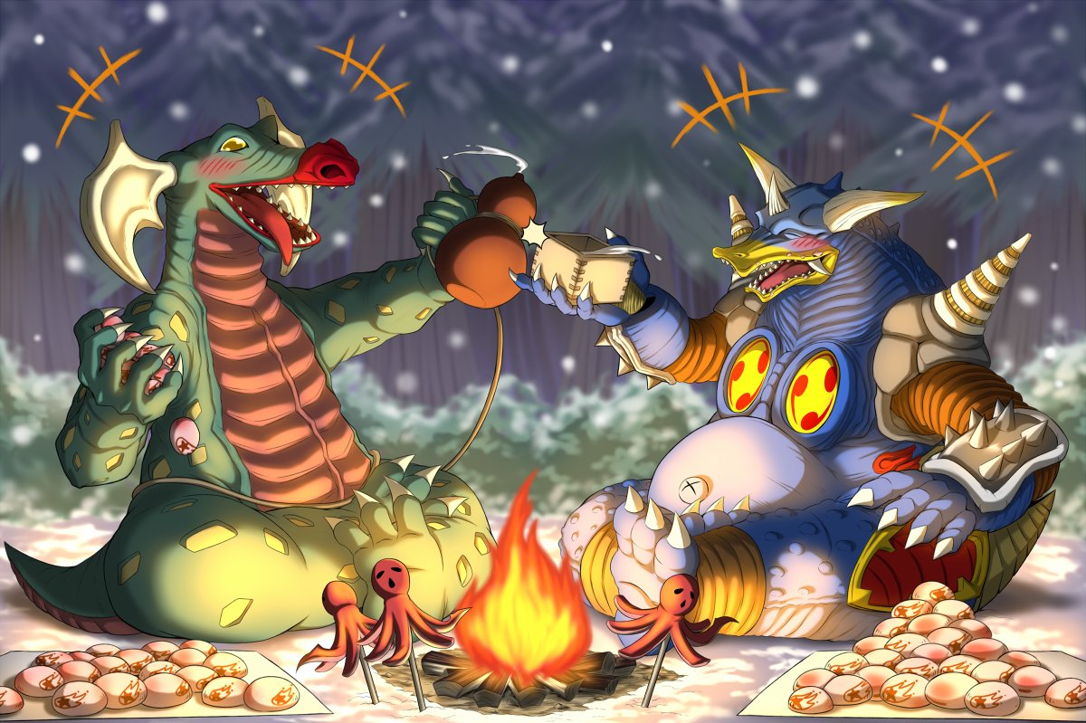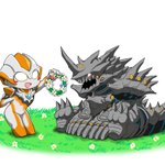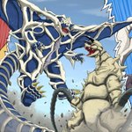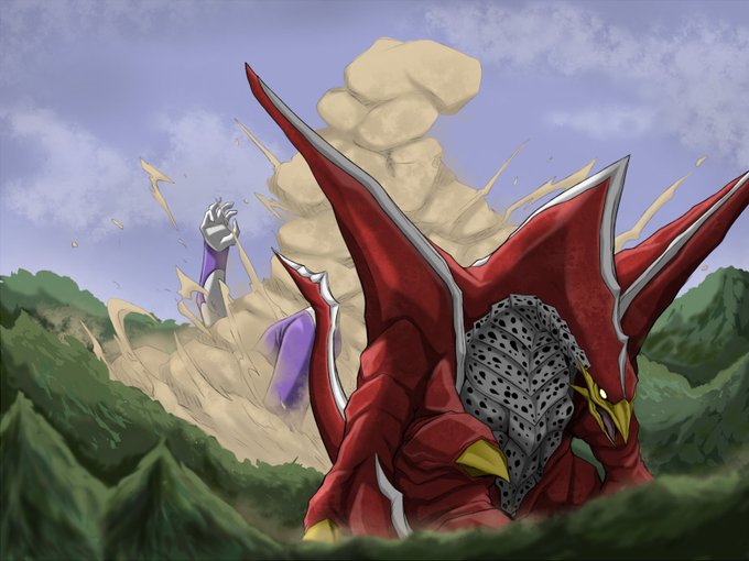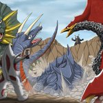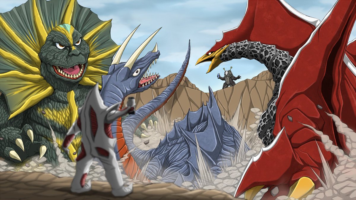 Skebのご依頼で「ジラース・キングザウルス三世・メルバの三体が三つ巴の戦いを繰り広げている」イラストを描かせて頂きました! 惑星ハマーでの一幕な感じで、レイオニクスも足しちゃいました!w ご依頼ありがとうございました!! skeb.jp/@mafuyu_tora/w… #Skeb