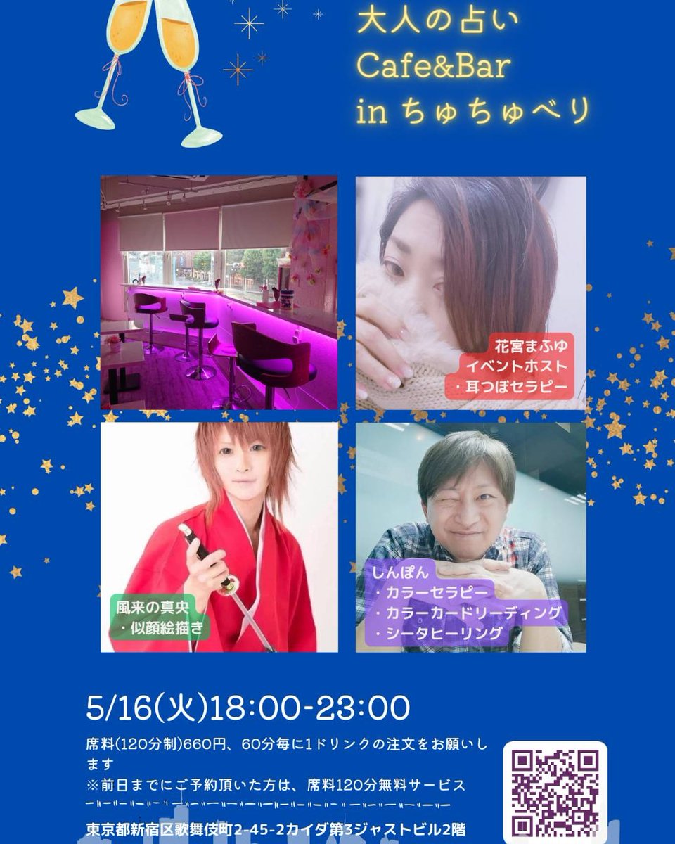 3 4 ちゅちゅリアバ当日はこちら💗 【大人の占いCafe&Bar】 今宵は #カラーセラピー、#シータヒーリング のしんぽん先生 #似顔絵 #イラストの 真央さん とまふゆの3名でおもてなしさせていただきます。 @shimpon_2416 @miragemao2012 @watashicustom 23/05/16 17:34