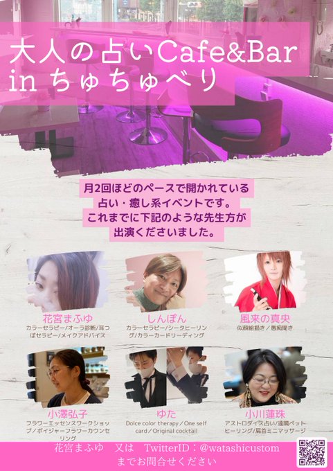 ちゅちゅリアバ当日はこちら💗 【大人の占いCafe&Bar】 今宵は #カラーセラピー、#シータヒーリング のしんぽん先生 #似顔絵 #イラストの 真央さん とまふゆの3名でおもてなしさせていただきます。 @shimpon_2416 @miragemao2012 @watashicustom