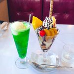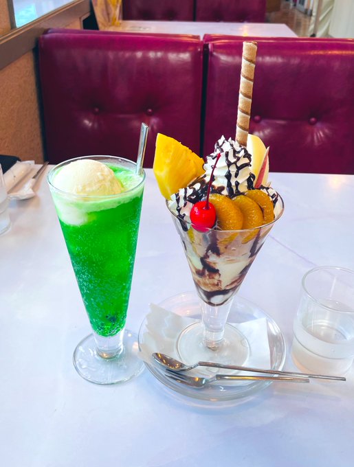 22 225 ふと立ち寄った喫茶店で最高のクリームソーダと最高のチョコパフェが出てきて最高でした。 23/07/16 20:27