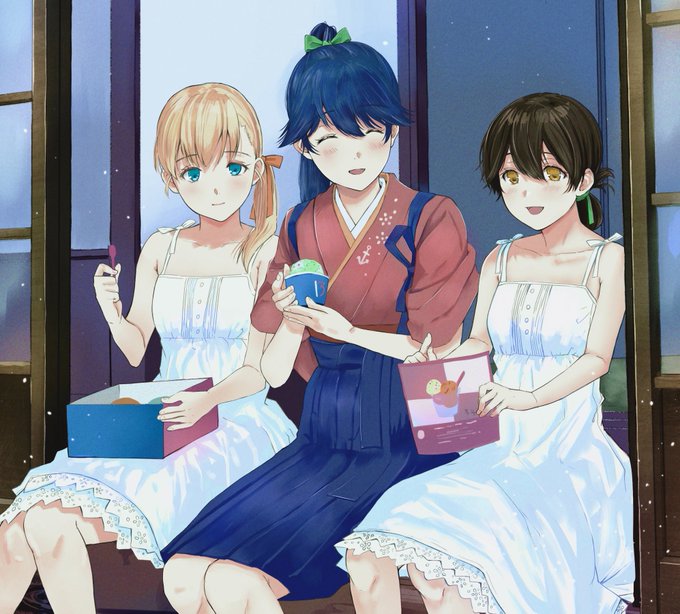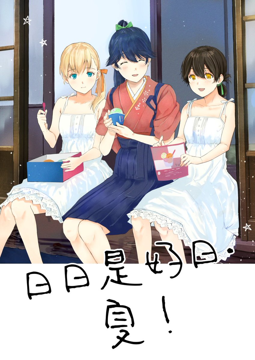579 2099 新刊表紙のイラストです。鳳翔さんと白ワンピ春日丸と神鷹です。 23/08/10 18:38