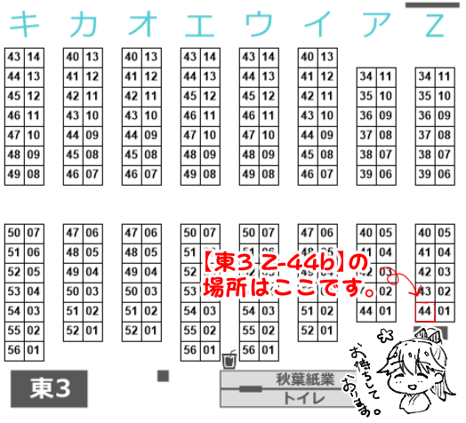 ◎あなたのサークル「真外制作処」は 土曜日 東地区 “Z” ブロック 44b に配置されています。 鳳翔さんの夏本出せるように頑張ります(◜௰◝)