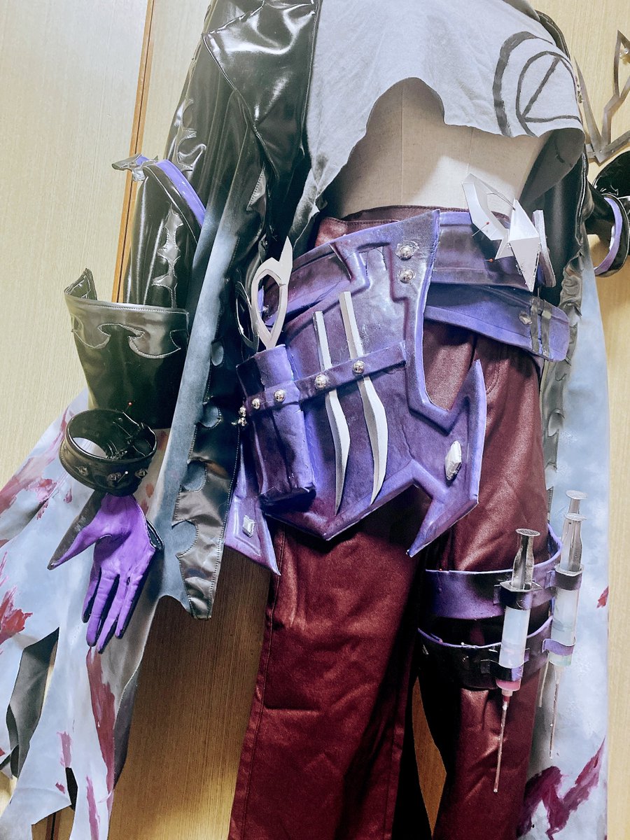 衣装できた!!メギド8魔星のバールベリトさんです✂︎カッコイイね!! コートのグラデーションと裾のシルエットすごい好き。シザーバッグと注射器ホルダーがカッコよく作れたのでお気に入りです💉 #曲崎さん進捗いかがですか