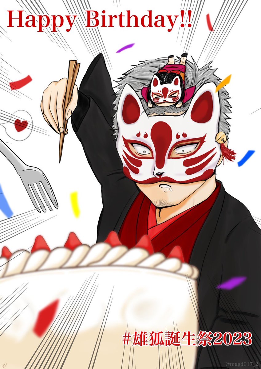 雄狐さんお誕生日おめでとうございます🎉 いただきますの瞬間こうなるだろうなぁと思い描きましたw 店主とてんちゅ(小さいの)は別個体かな? ケーキ🎂ゆっくりモグモグしてくださいね☆ #雄狐誕生祭2023 #幻空堂ファンアート
