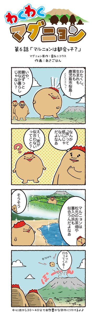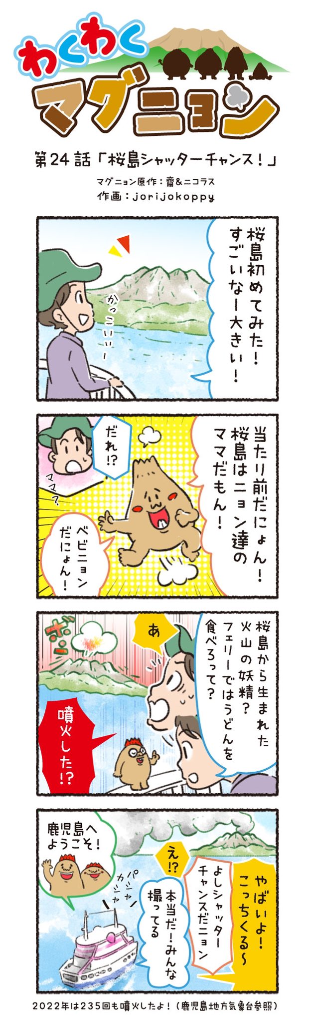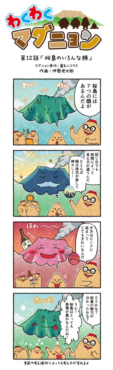 今回の4コマ漫画は @DVjgo2ESgqbCtGR さんが応募してくれた「桜島」だよ! 毎日見ても飽きない理由のひとつは、これだったんだニョン ˊ•𓈟•ˋ 🔎✨ 第12話:桜島のいろんな顔 #マグニョン #漫画が読めるハッシュタグ #4コマ漫画