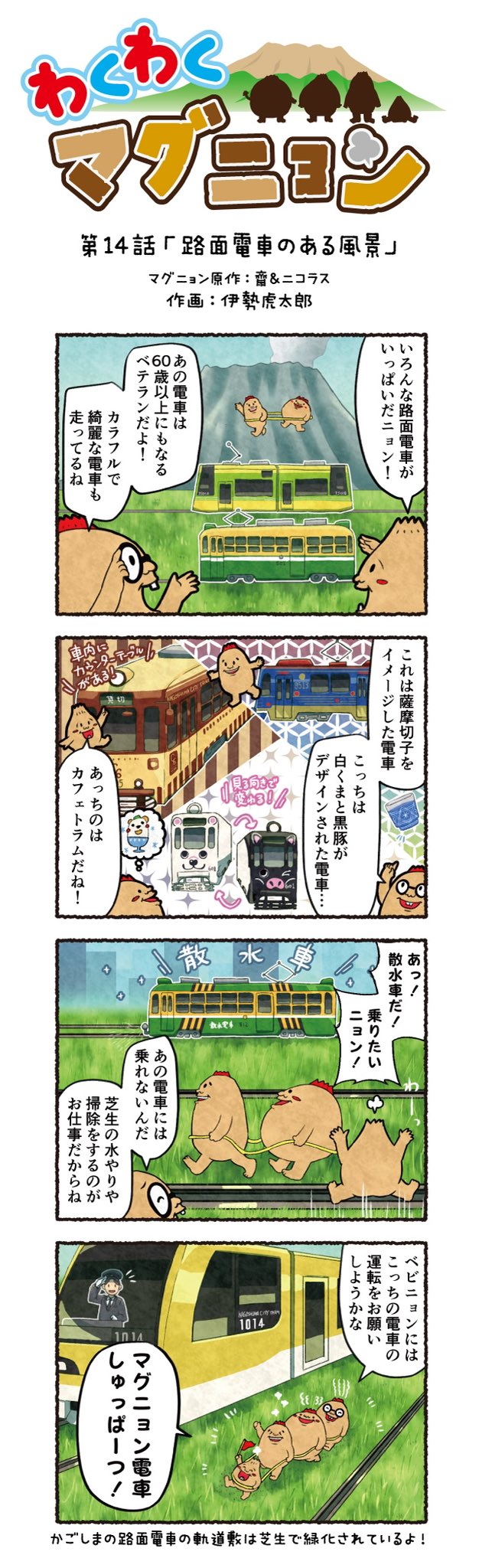 今回の4コマ漫画は ミーマイ さんが応募してくれた「かごしまの路面電車」がテーマだよ🚋🌟 大正元年12月1日に始まった鹿児島市の路面電車🚃 なんと今日で110周年㊗️ 🎊 第14話:路面電車のある風景 #マグニョン #漫画が読めるハッシュタグ #4コマ漫画