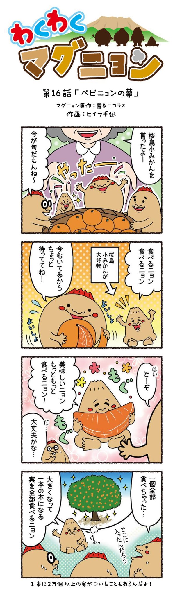今回の4コマ漫画は、今が旬の桜島小みかんがテーマだよ🍊🍊 第16話:ベビニョンの夢 桜島小みかんは、その名の通り、直径わずか4~5センチと小粒!!!だけど、味は思わずビックリするほど甘みがぎゅ〜っとつまっているよ🤭🍊✨ #マグニョン #漫画が読めるハッシュタグ #4コマ漫画
