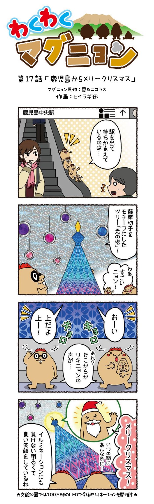 今回の4コマ漫画は、もうすぐやってくる!クリスマスがテーマだよ🎄🎁🤶 第17話:鹿児島からメリークリスマス まちがキラキラすると、心も踊るね🤗🌟 #マグニョン #漫画が読めるハッシュタグ #4コマ漫画