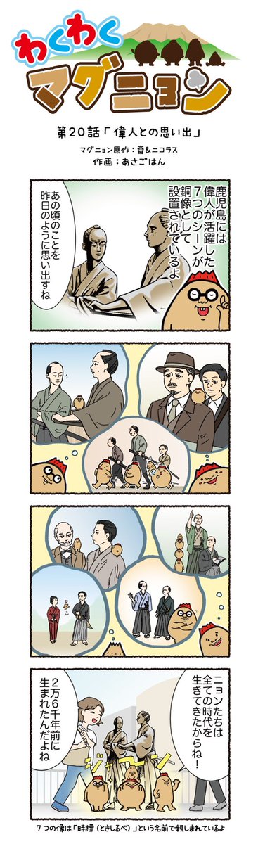 今回の4コマ漫画は rxoka.12 さんが 応募してくれたテーマだよ👏✨ 第20話:偉人との思い出 鹿児島市のメインストリート沿いには 近代文化を作った偉人たちに会える 観光オブジェがあるんだよ〜🥸🎩✨ #マグニョン #漫画が読めるハッシュタグ #4コマ漫画