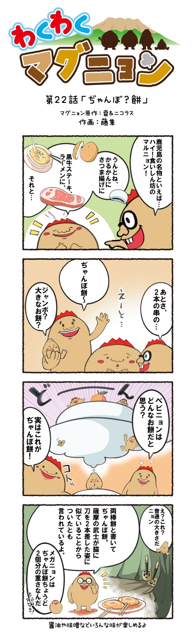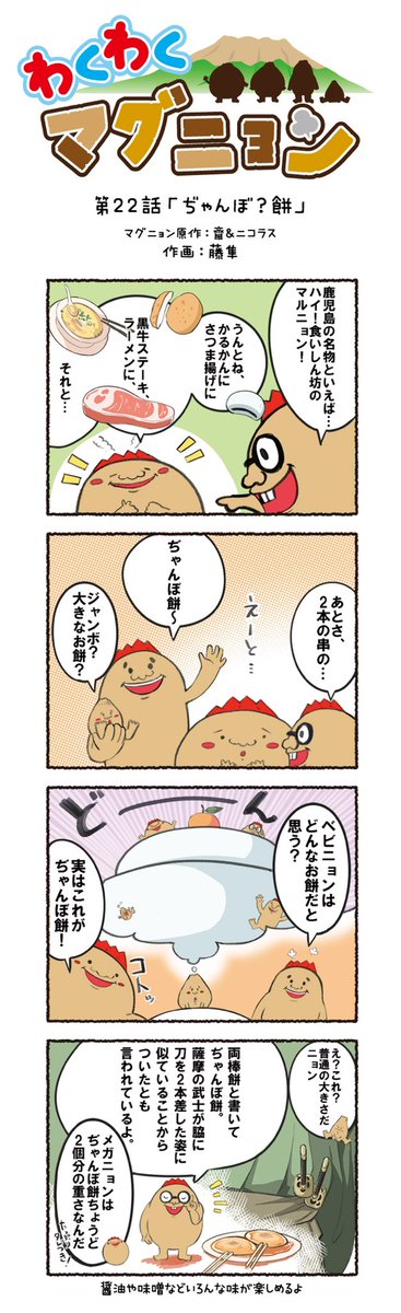 今回の4コマ漫画は@riran_rina さんが 応募してくれたテーマだよ👏✨ 第22話:ぢゃんぼ?餅 もちもち〜っとしてて、甘辛くって 10本ぺろっと食べちゃう美味しさ😋🧡 #マグニョン #漫画が読めるハッシュタグ #4コマ漫画