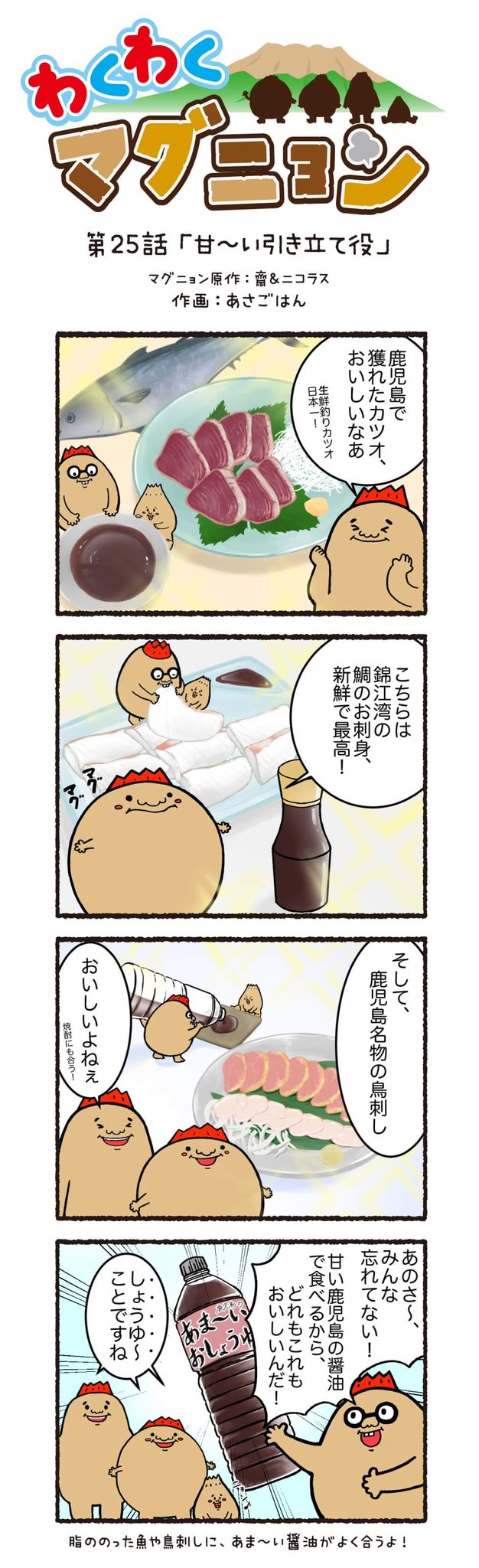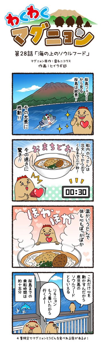 今回の4コマ漫画は kaito3base さんの応募テーマだよ👏✨ 第28話:海の上のソウルフード 桜島や錦江湾を楽しみながら 一緒においしさを噛み締めよう😆🌟 #マグニョン #漫画が読めるハッシュタグ #4コマ漫画