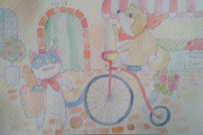 風船売りの少年🎈No.14 こむちゃん、ちゃちゃちゃん、はっちぃ、と、おれ。秋、満喫中。 #イラスト依頼 #絵本 #絵本イラスト #絵はがき #猫好きさんと繋がりたい #水彩画 #みんなで楽しむTwitter展覧会 #風船売りの少年