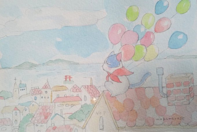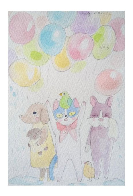 風船売りの少年🎈No.6 風船を売ってたら突然の雨。みんな慌てて風船の下に集まったの。おれ、びっくり❗️ 何だかおかしくなってみんな笑った。 #水彩画 #イラスト好きな人と繋がりたい #イラスト #猫好きさんと繋がりたい #風船売りの少年 #似顔絵 #絵本 #絵葉書