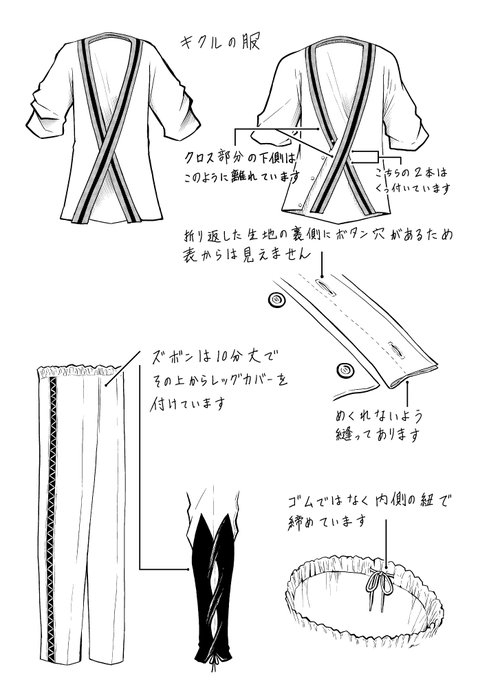 ニコニコ動画でキクルの服の構造が分からないというコメントを見かけたのですが、同様の質問が制作様からも来ておりまして、こちらが当時送った回答です。 彼がなぜこんな上着を着ているのかは、この疑問が生まれた事自体が答えに直結しています。