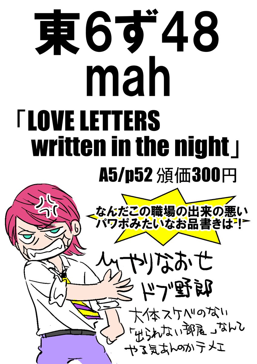6/25 東6ず48b ム三プチ「MUCHO NOCHE」発行 LOVE LETTERS written in the night(P52/頒価300円) 相変わらず毒にも薬にもならないム三です 通販の予定はございません(1/3)