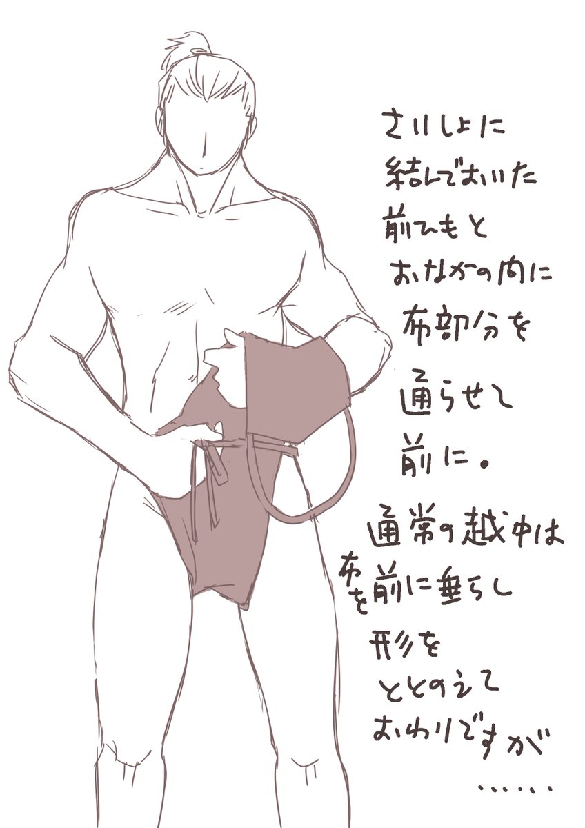 ふんどし装着手順絵上げ直しします。 越中の装備手順を調べたときに、前の紐から結ぶのか!と驚きましたので描いてみました。